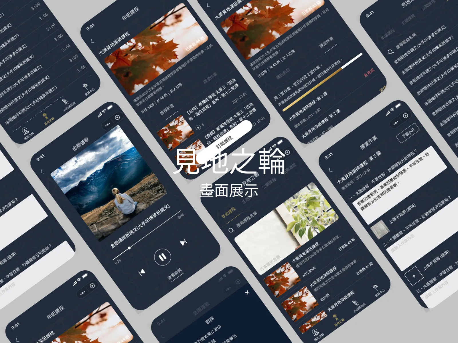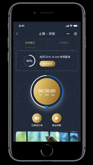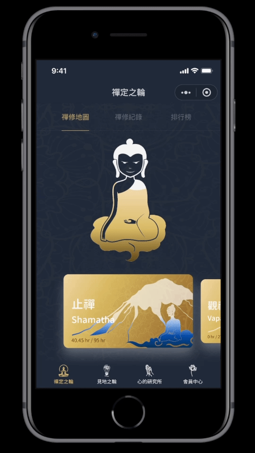 包含六種不同打坐形式,每張小卡上依據完成進度逐漸填滿水面。進入所選打坐方式後,可以選擇「定時模式」或「計時模式」完成預計時數。打坐過程中隨時都可以開啟引導語音,以及暫停繼續或停止打坐;完成後便可從記錄查看以及時數排名。